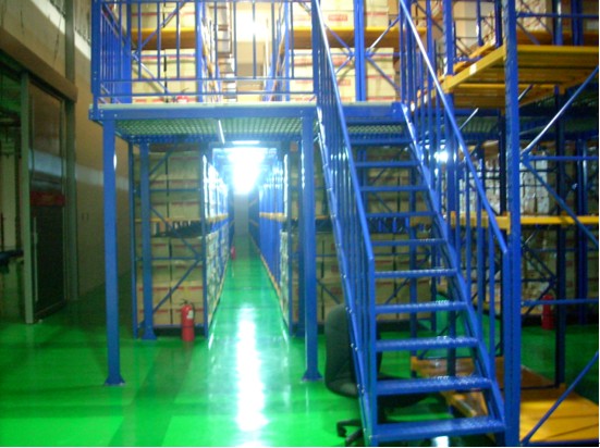 此類系統(tǒng),通常利用中型擱板式貨架或重型擱板式貨架作為主體和樓面板的支撐(根據(jù)單元貨架的總載重量來決定選用何種貨架),樓面板通常選用冷軋型鋼樓板、花紋鋼樓板或鋼格柵樓板。此類系統(tǒng)在汽車零部件領(lǐng)域、汽車4S店、輕工、電子等行業(yè)有較多應(yīng)用。